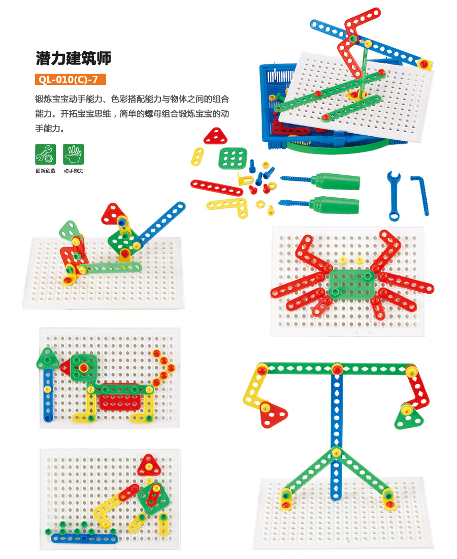 鍛煉寶寶動手能力、色彩搭配能力與物體之間的組合能力。開拓寶寶思維,簡單的螺母組合鍛煉寶寶的動手能力。