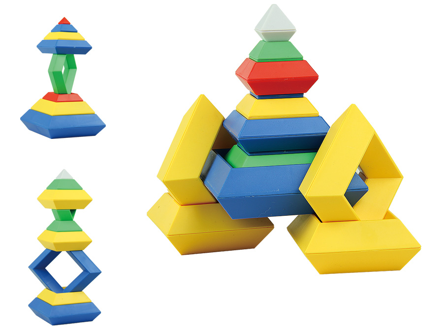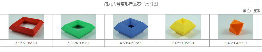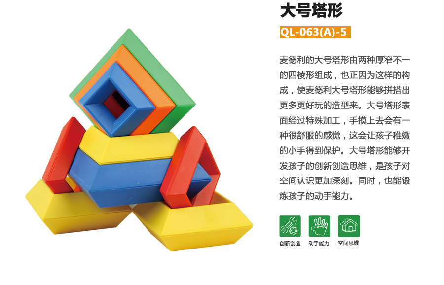 麥德利的大號塔形由兩種厚窄不一的四棱形組成,也正因為這樣的構(gòu)成,使麥德利大號塔形能夠拼搭出更多更好玩的造型來。