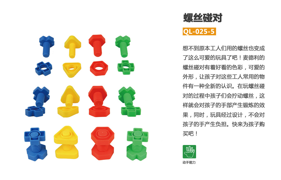 想不到原本工人們用的螺絲也變成了這么可愛的玩具了吧!麥德利的螺絲碰對(duì)有著好看的色彩,可愛的外形,讓孩子對(duì)這些工人常用的物件有一種全新的認(rèn)識(shí)。