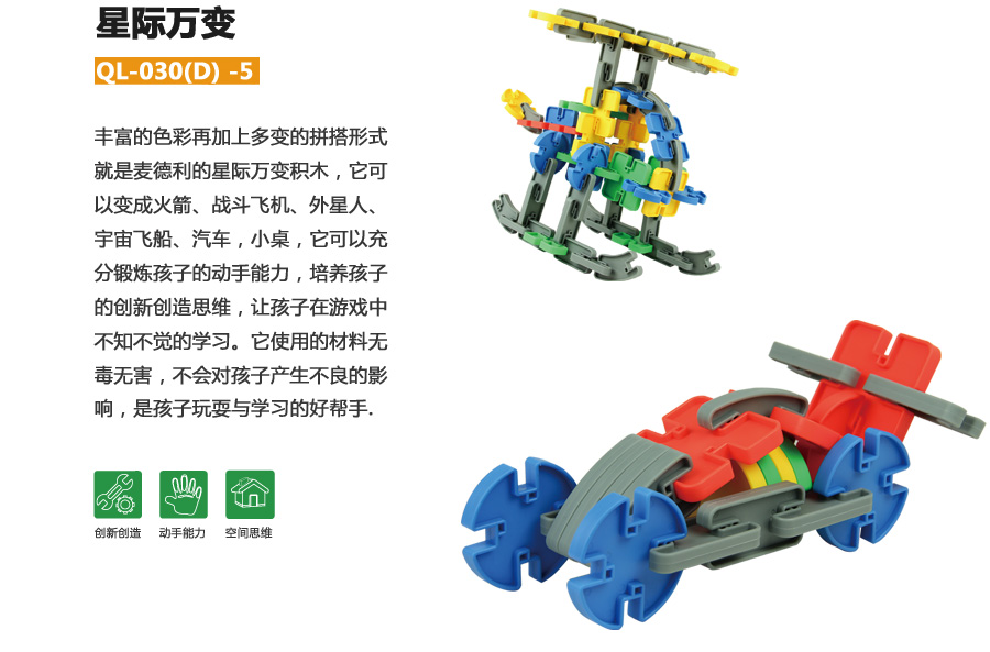 富的色彩再加上多變的拼搭形式就是麥德利的星際萬變積木,它可以變成火箭、戰(zhàn)斗飛機(jī)、外星人、宇宙飛船、汽車,小桌。