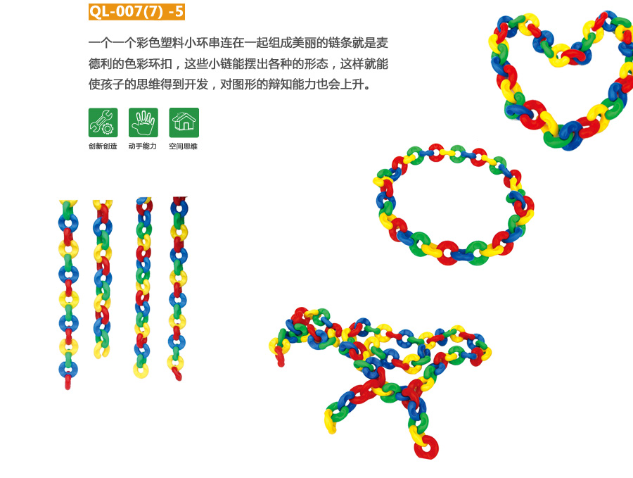 一個(gè)一個(gè)彩色塑料小環(huán)串連在一起組成美麗的鏈條就是麥德利的色彩環(huán)扣,這些小鏈能擺出各種的形態(tài),這樣就能使孩子的思維得到開發(fā),對(duì)圖形的辯知能力也會(huì)上升。