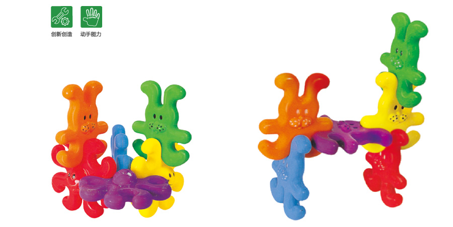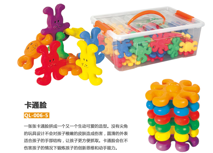 一張張卡通臉拼成一個(gè)又一個(gè)生動(dòng)可愛(ài)的造型。沒(méi)有尖角的玩具設(shè)計(jì)不會(huì)對(duì)孩子稚嫩的皮膚造成傷害,圓滑的外表適合孩子的手部結(jié)構(gòu),讓孩子更方便抓取。