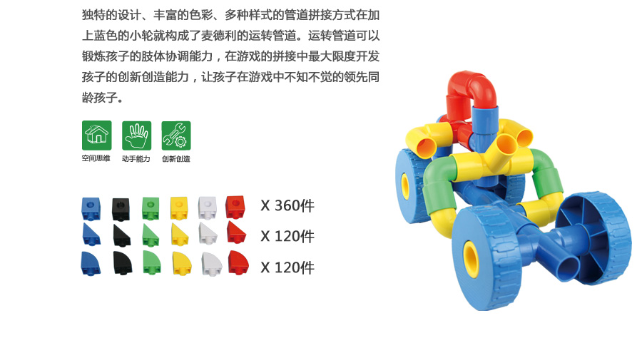 獨(dú)特的設(shè)計、豐富的色彩、多種樣式的管道拼接方式在加上藍(lán)色的小輪就構(gòu)成了麥德利的運(yùn)轉(zhuǎn)管道。